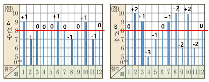B선수 편차의 평균 = (0+2+1-3-1+0+1+2-2+2-2+0)/12 =0