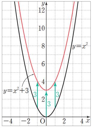 아래 예를 살펴보면 y=x^2+3의 그래프는 y=x^2의 그래프를 y축의 방향으로 +3만큼(위로 3만큼) 평행이동한 것으로!