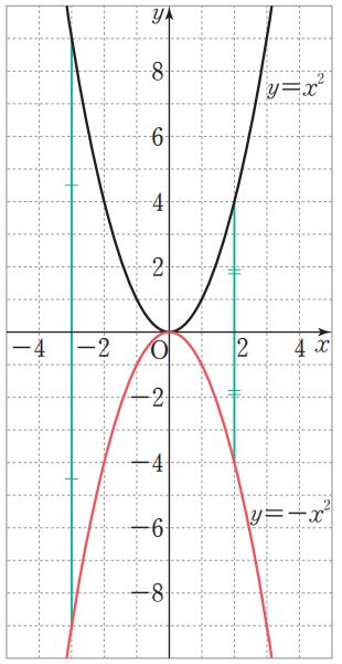 x의 값이 같을 때, y= - x^2의 함숫값은 y=x^2의 함숫값과 절댓값은 같고 부호는 반대임을 확인할 수 있다.