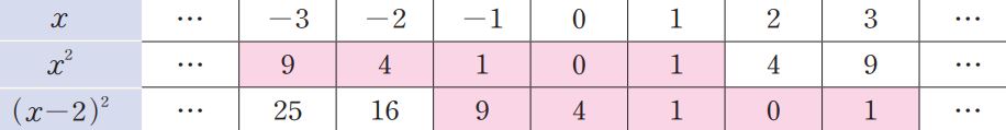 즉, 이차함수 y=(x-2)^2에서 x의 값이 -1,0,1,2,3일 때의 함숫값은 이차함수 y=x^2에서 x의 값이 -3,-2,-1,0,1일 때의 함숫값과 같다.