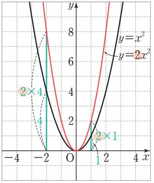 위의 상황을 그래프로 나타내면 x의 값이 같을 때, y=x^2의 y값보다 y=2x^2의 y의 값이 위로 2배 높은 곳에 위치한다.